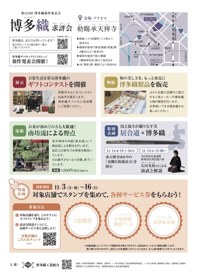 第123回博多織求評会では周遊企画としてスタンプラリーを開催します。 対象店舗でスタンプを集めて各種サービス券と交換してください 【開催期間】 11月3日(月・祝)〜16日(日) 【対象店舗】 対象店...